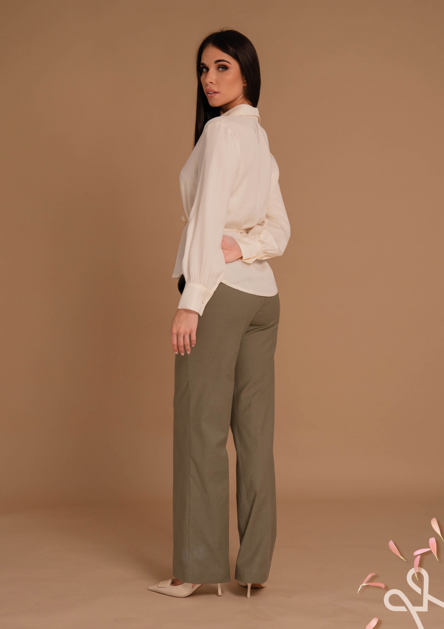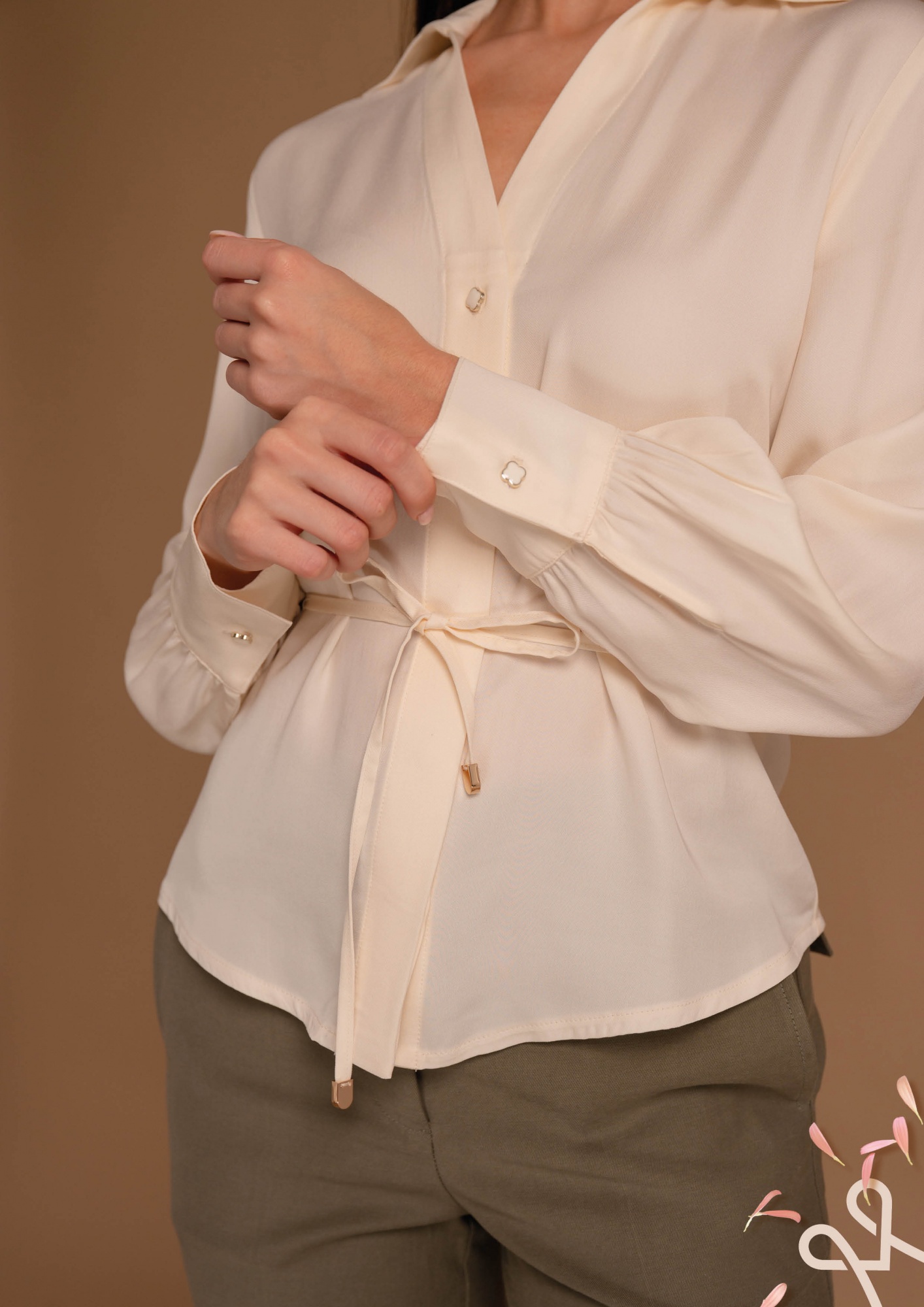 Vaj színű, kevert szálas, muszlin hatású női ing gallérral és derékban megkötővel, amely könnyed és elegáns tavaszi megjelenést biztosít.