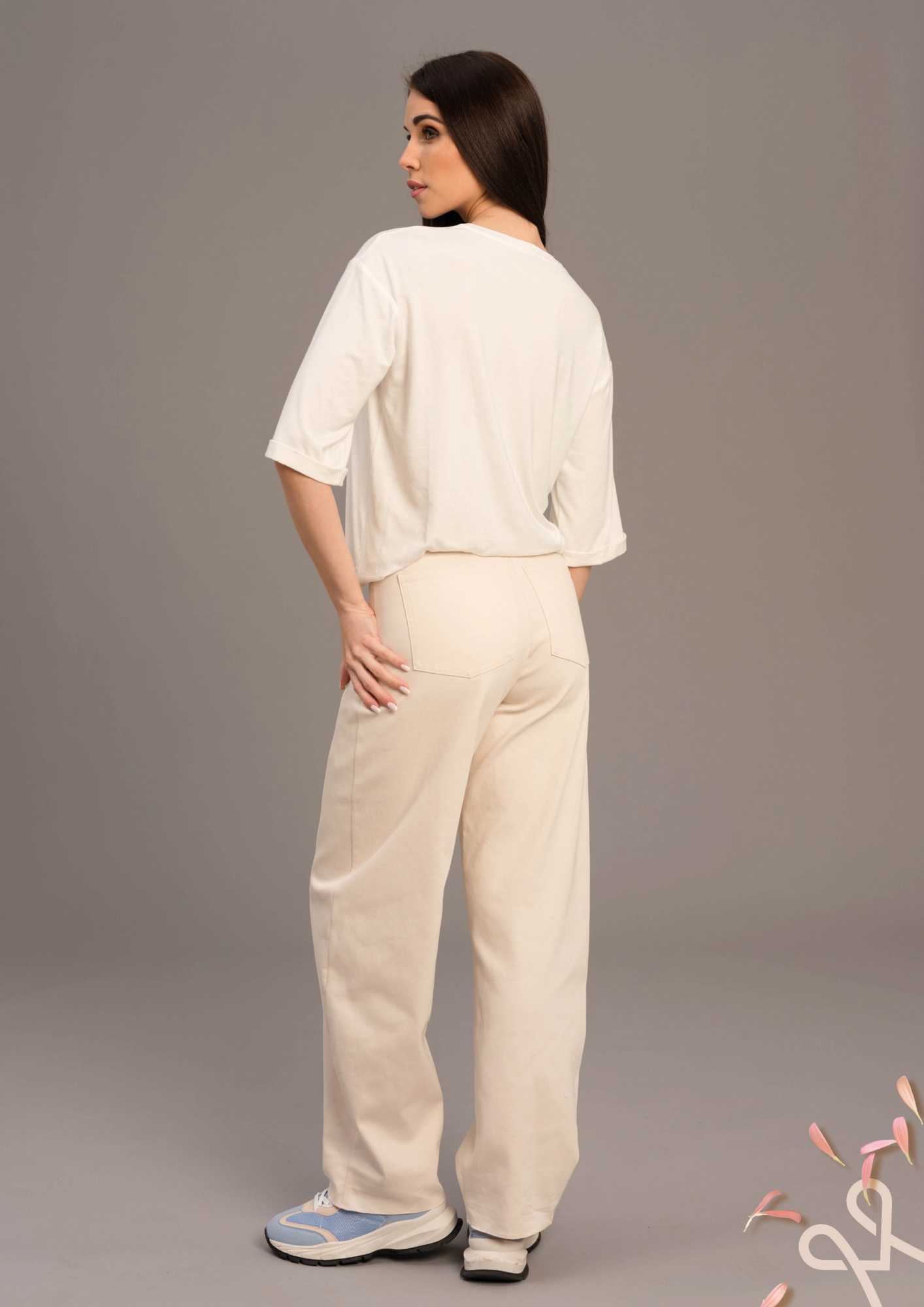Bővebb szárú, elasztikus pamutvászon női nadrág elején cipzáras és kapcsos záródással, övbújtatóval, elegáns vajszínben.