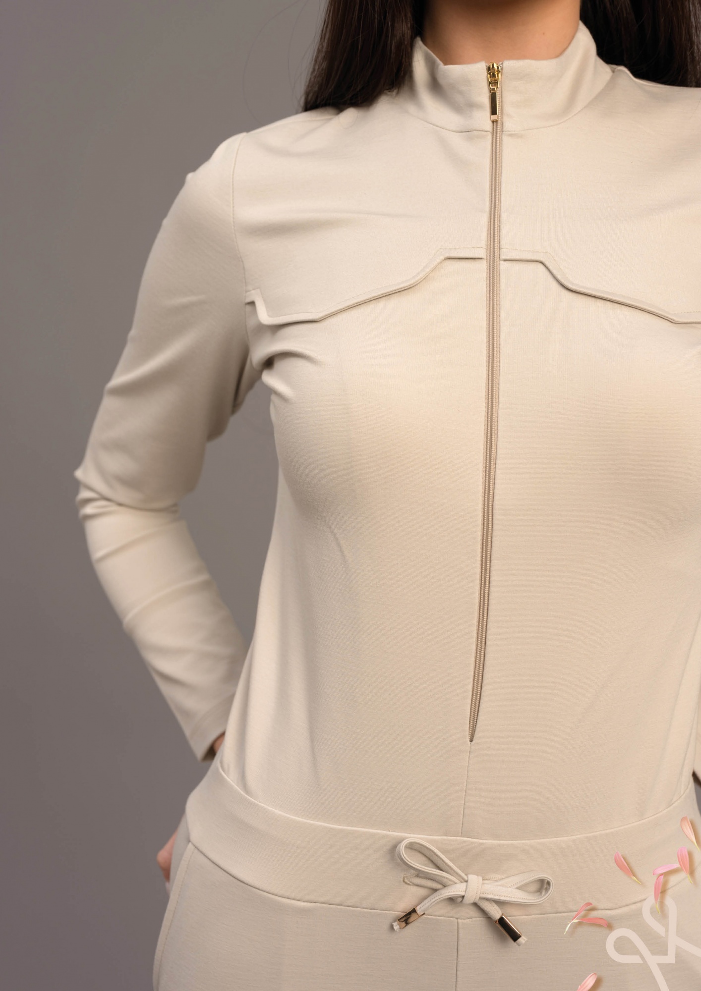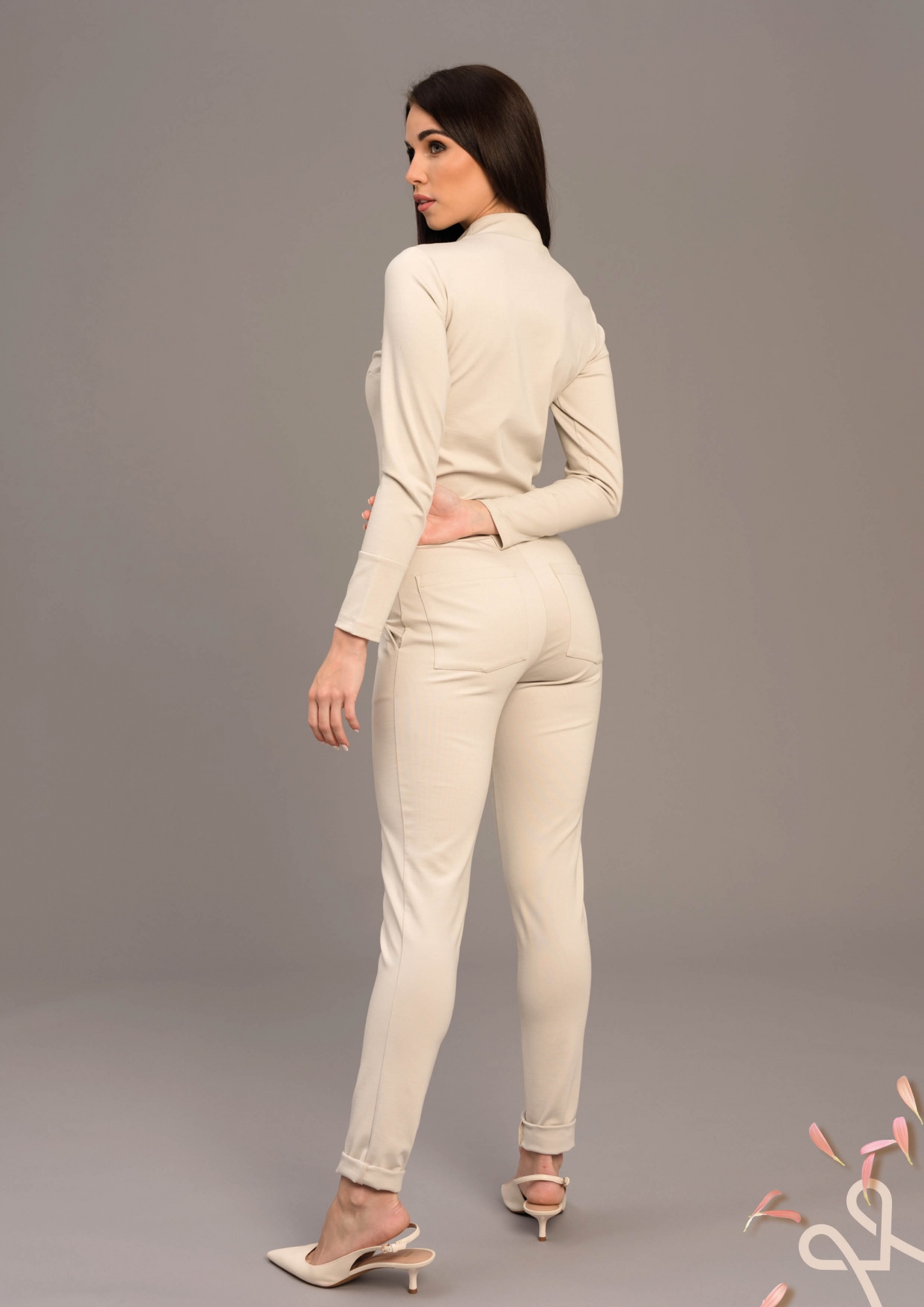 Vaj színű, szűk, alakot követő puntó overál állítható derékmegkötővel, elején cipzáras záródással és magas álló gallérral, amely modern és nőies tavaszi megjelenést biztosít.