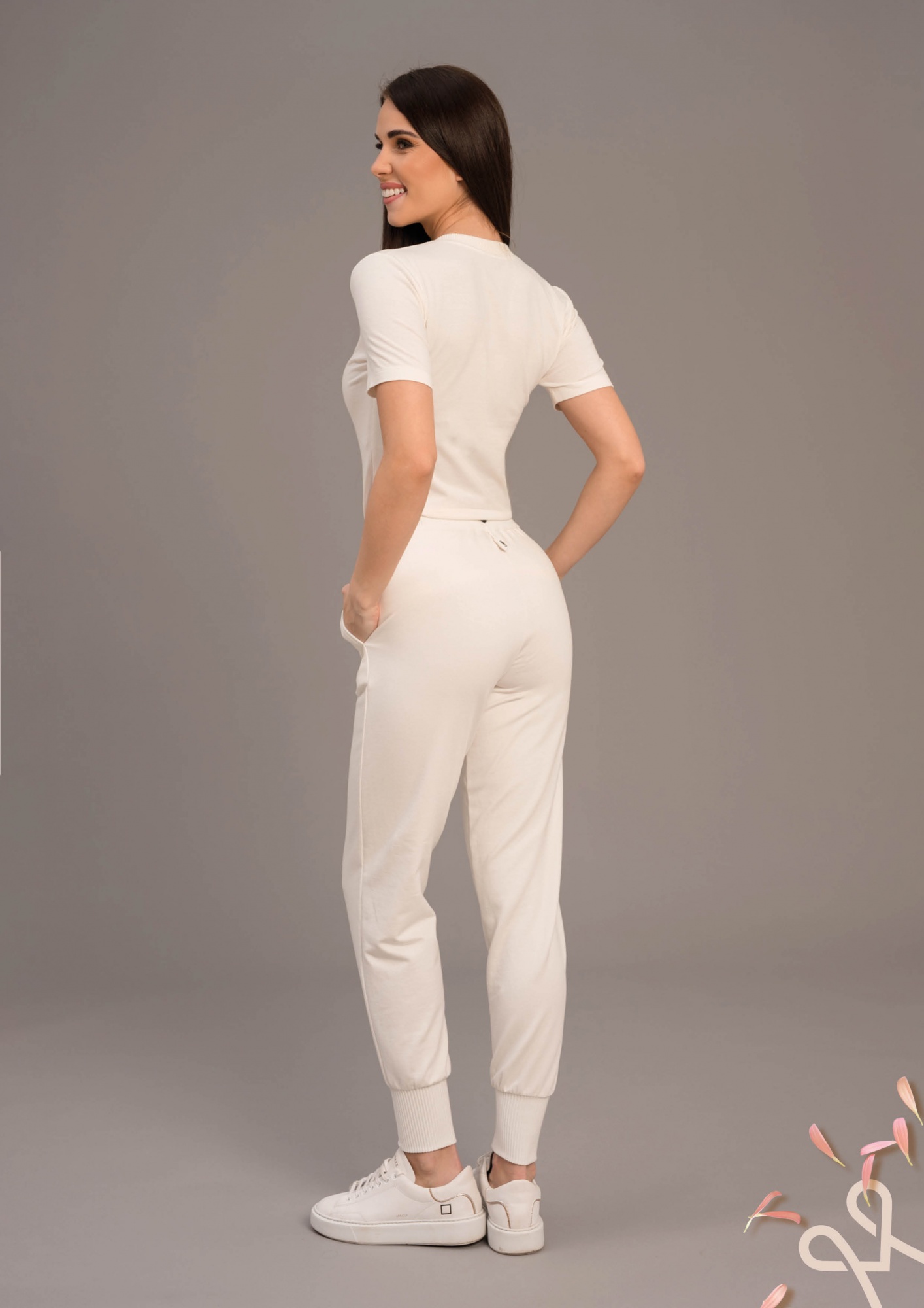 Sportos fazonú, vajszínű elasztikus puntó nadrág gumis derékrésszel, alján passzéval és oldalzsebekkel a kényelmes, modern megjelenésért.