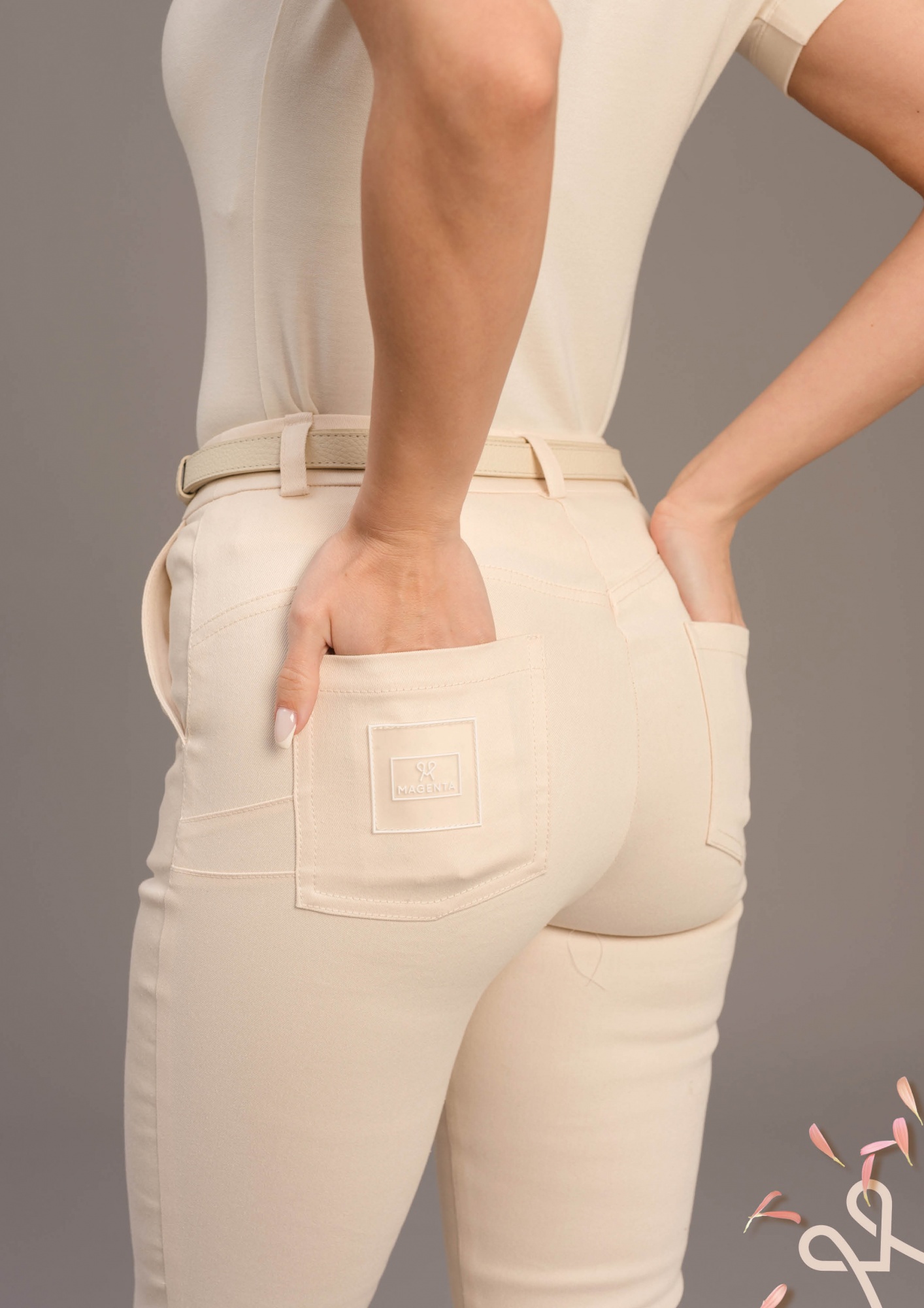 Egyenes fazonú, vászon női nadrág elején cipzáras és gombos záródással, oldal- és hátzsebekkel, övbújtatóval, elegáns vajszínben.