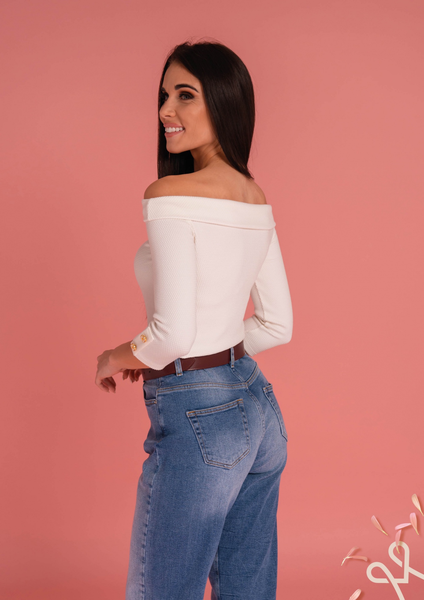 Vaj színű, szűkebb fazonú, vállra lehúzható női pamut felső 3/4 ujjal, rugalmas anyagból és ujján díszgombokkal, amely elegáns és stílusos tavaszi megjelenést biztosít.