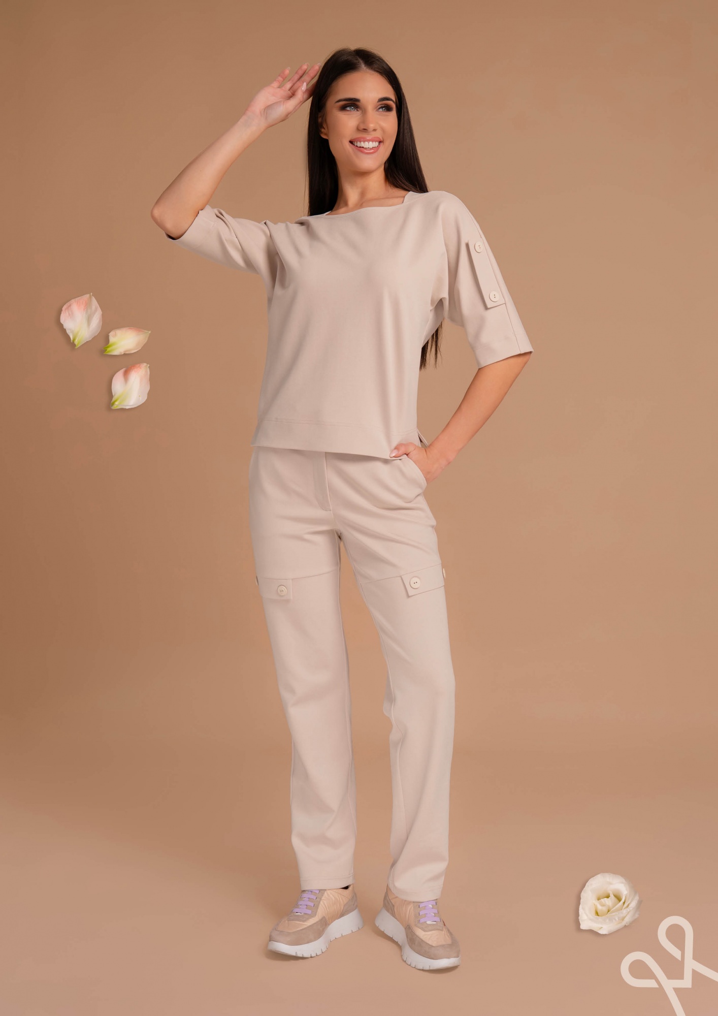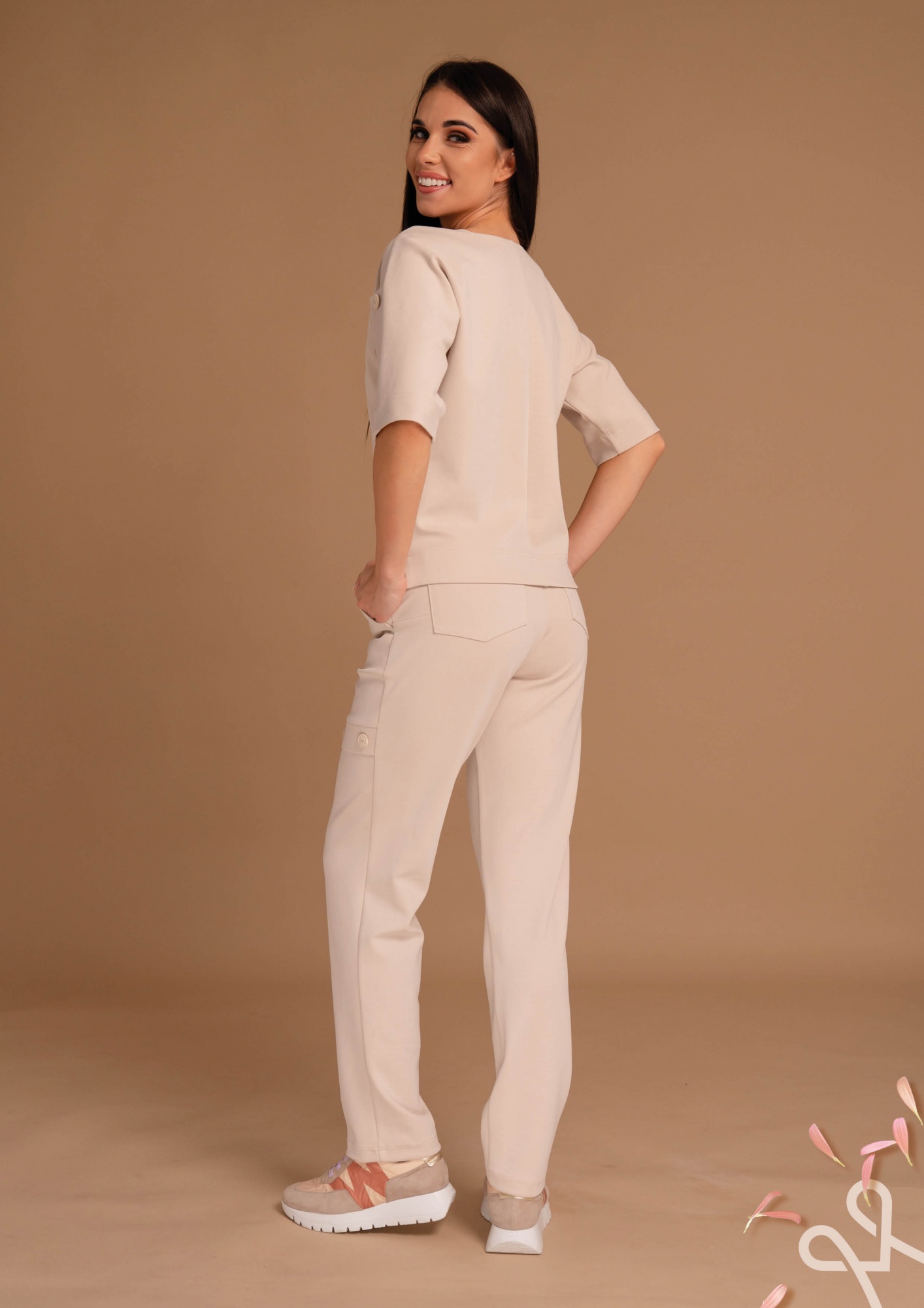 Világos bézs színű, szűkebb szárú és sportosabb fazonú nadrág, amelyet az oldalsó zsebfedős részletek, valamint a gombos és cipzáras záródás tesznek praktikussá és stílusossá.