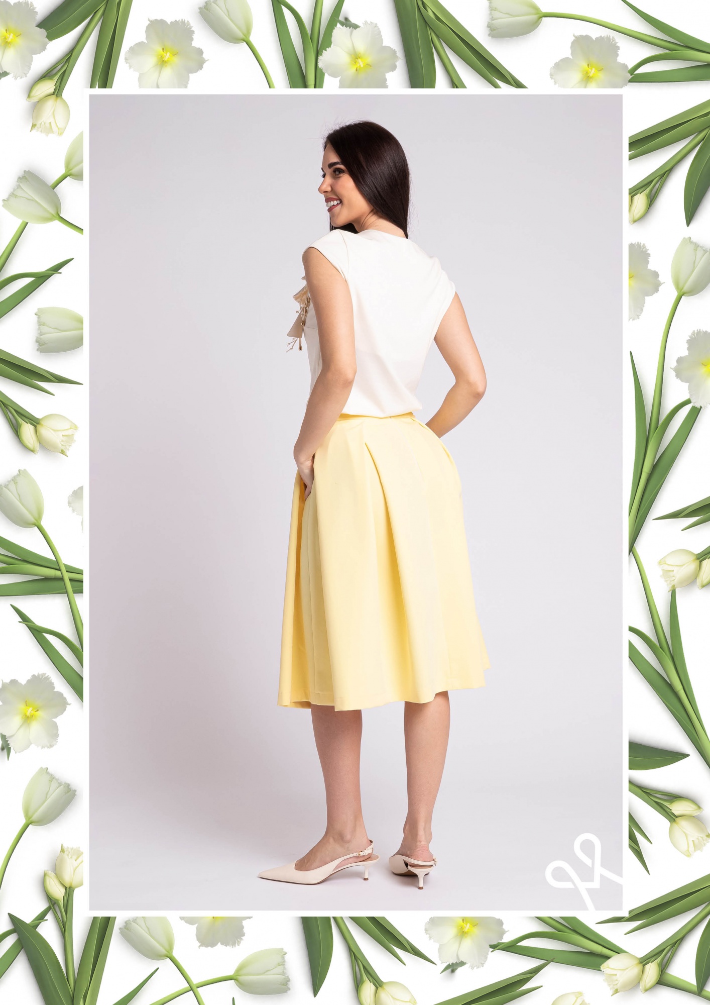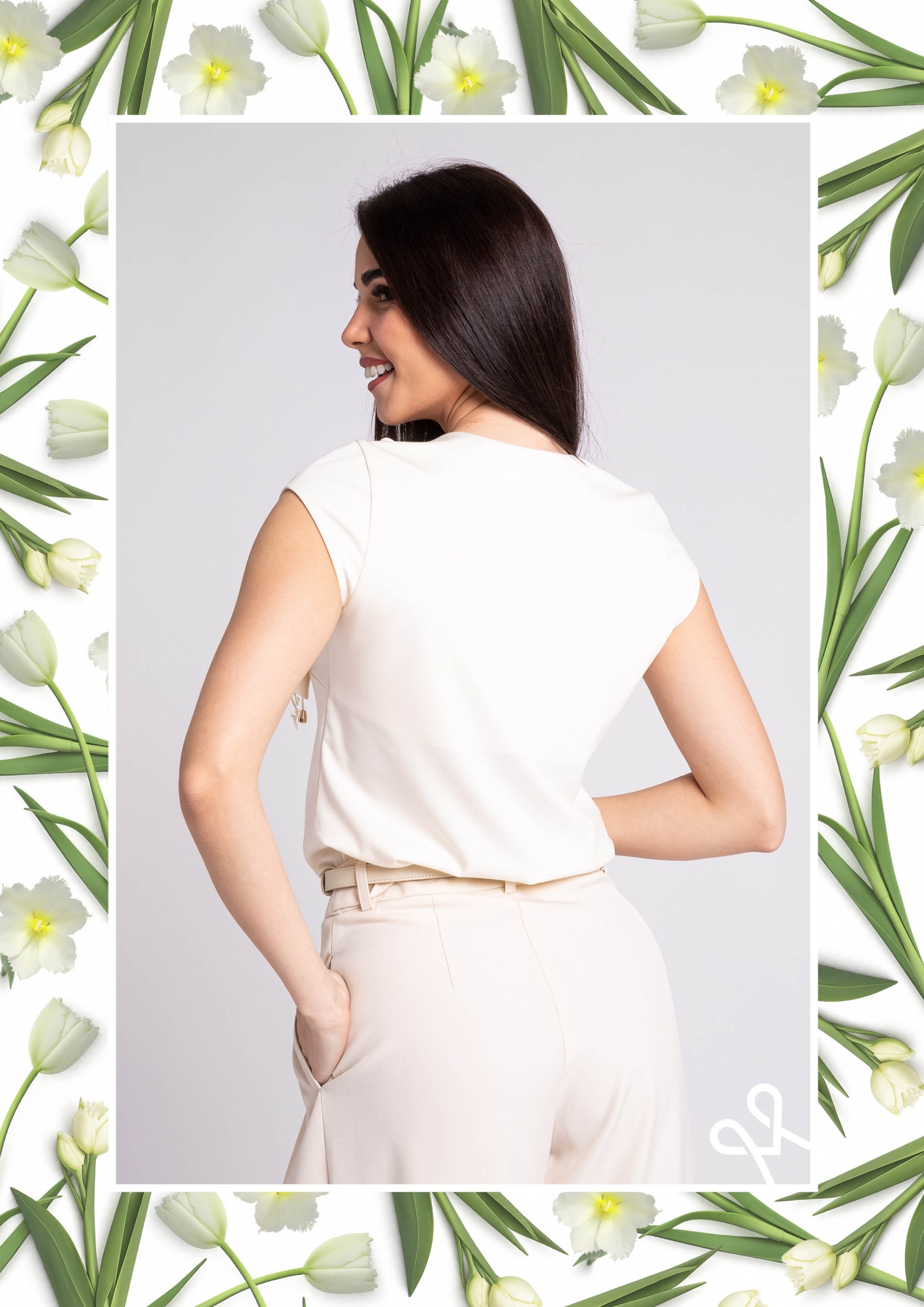 Lazább fazonú, enyhén elasztikus női ujjatlan felső japán ujjas szabással, kerek nyakkivágással és elején virág díszítéssel, amely könnyed és nőies tavaszi viselet.