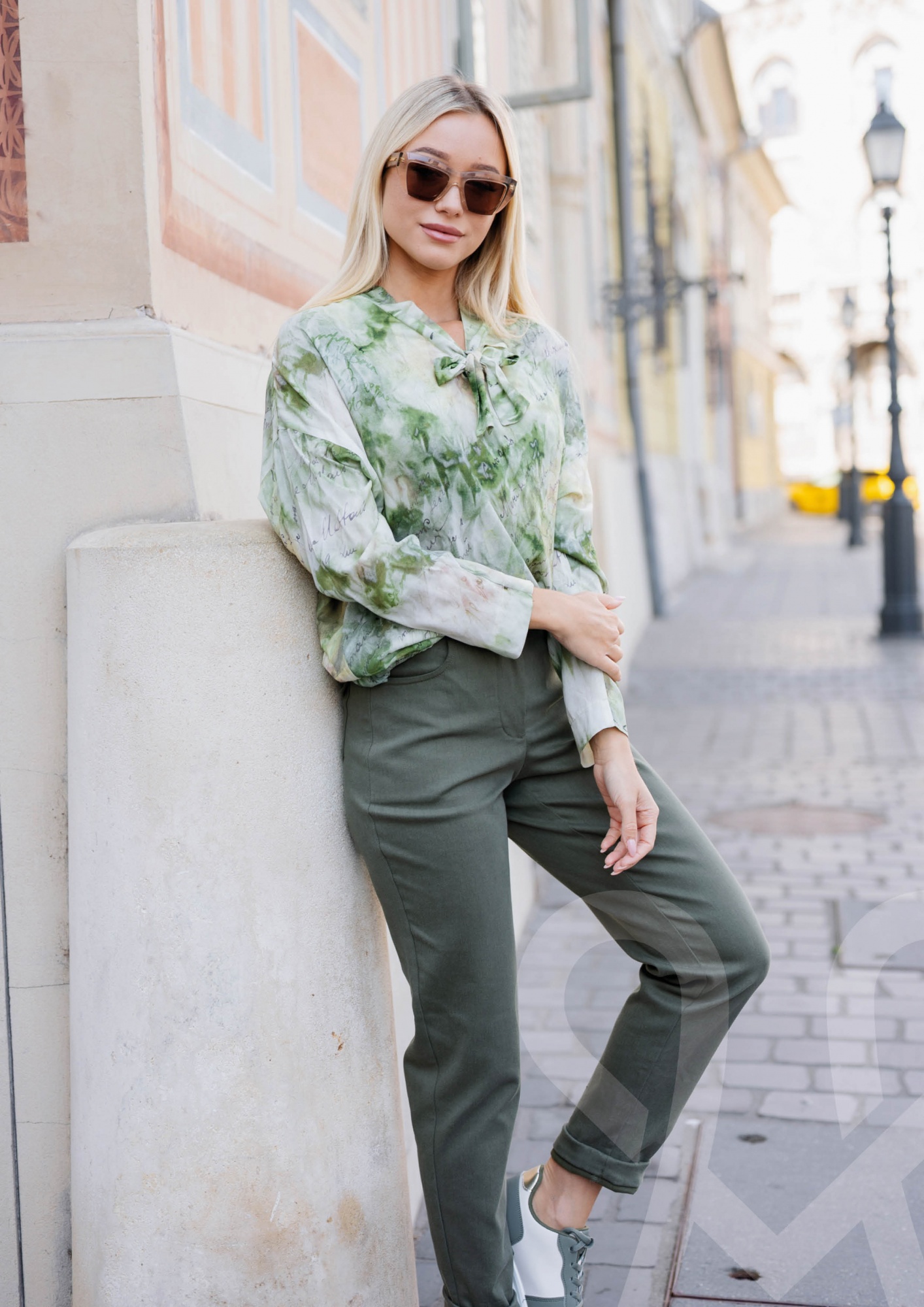 Bővebb szabású, könnyű, kevert szálas anyagból készült zöld mintás Magenta felső, amely stílusos és kényelmes választás a mindennapokra. Laza esése és légies anyaga elegánsan simul a testre, miközben maximális komfortot nyújt. A nyakrész masnis díszítése finom nőiességet és játékos részletet kölcsönöz a darabnak, amely így egyszerre modern és romantikus hangulatú. Ez a különleges felső ideális választás lehet munkába, városi sétákhoz vagy akár egy esti programhoz is, hiszen könnyen kombinálható nadrággal és szoknyával egyaránt.