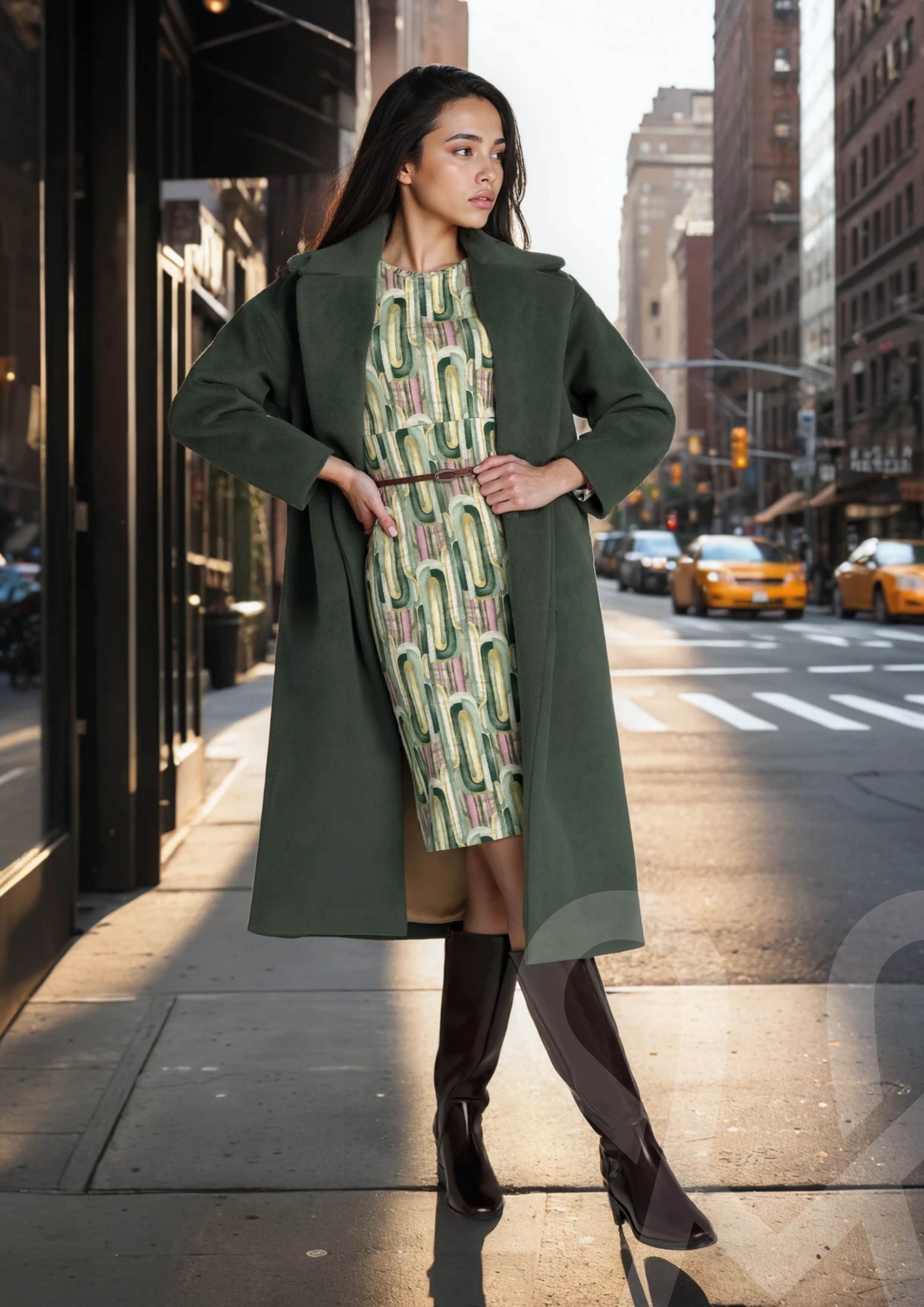 Bővebb fazonú, térdig érő zöld szövetkabát széles kihajtós gallérral és praktikus zsebekkel, mely elegáns megjelenést és kényelmes viseletet biztosít a hűvösebb napokon.