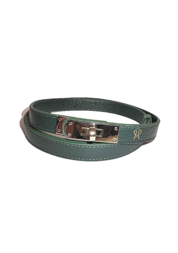 Vékony, valódi bőrből készült Magenta öv zöld színben, állítható csattal. Letisztult megjelenésének köszönhetően könnyedén kombinálható mind hétköznapi, mind elegáns öltözetekkel.