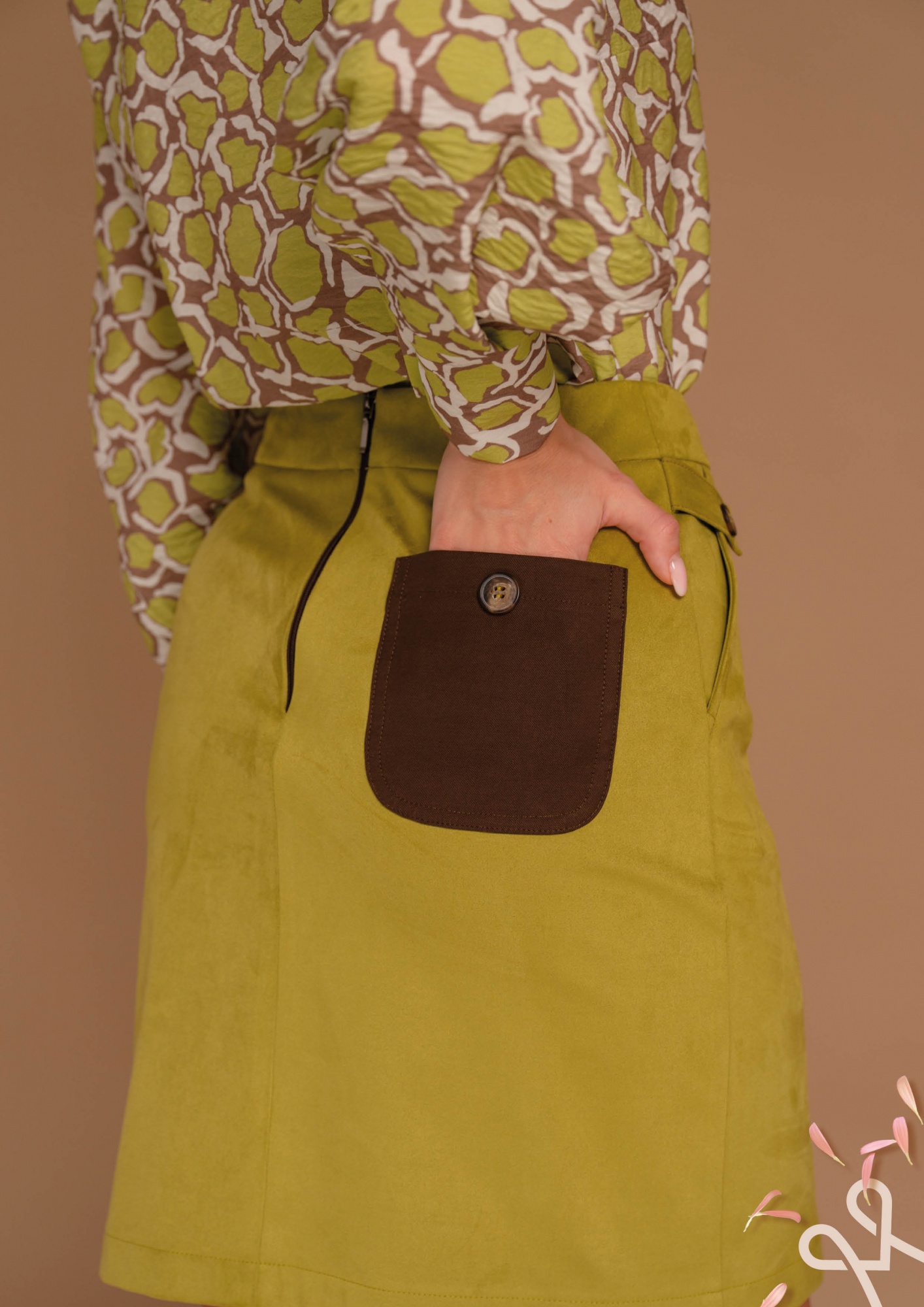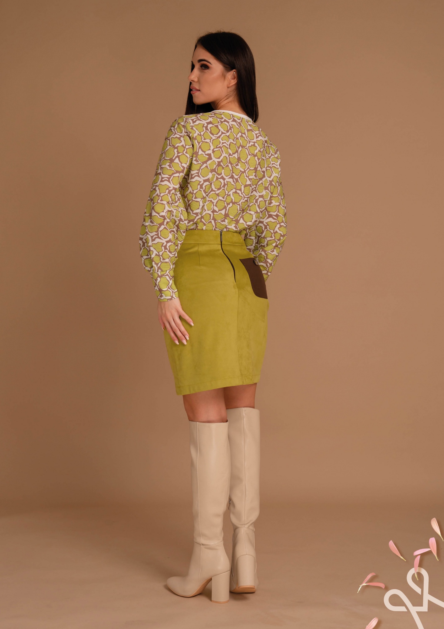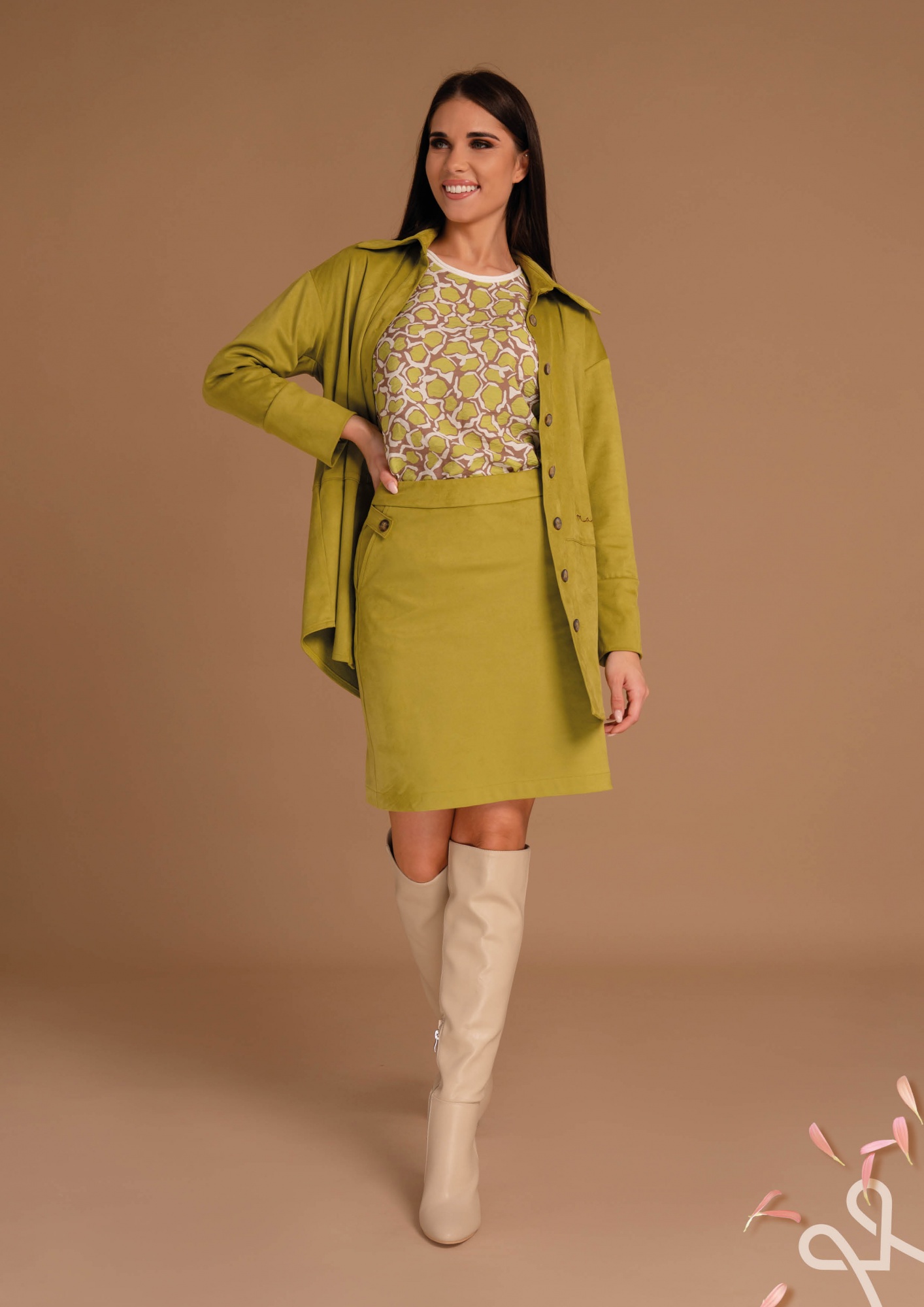 Zöld színű, szűkebb, alakot követő fazonú, velúr anyagból készült, térd fölé érő női szoknya hátul cipzáras záródással, amely elegáns és nőies tavaszi megjelenést biztosít.