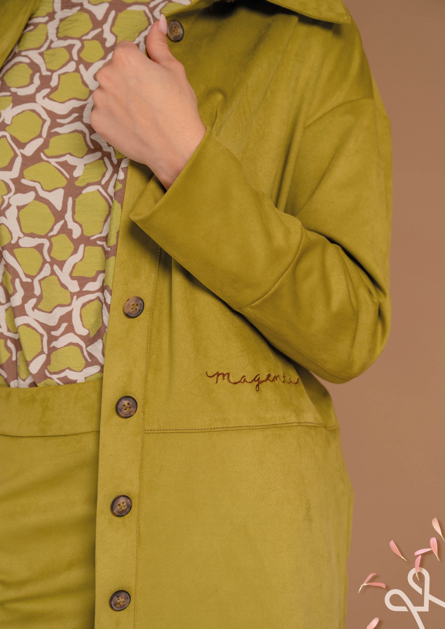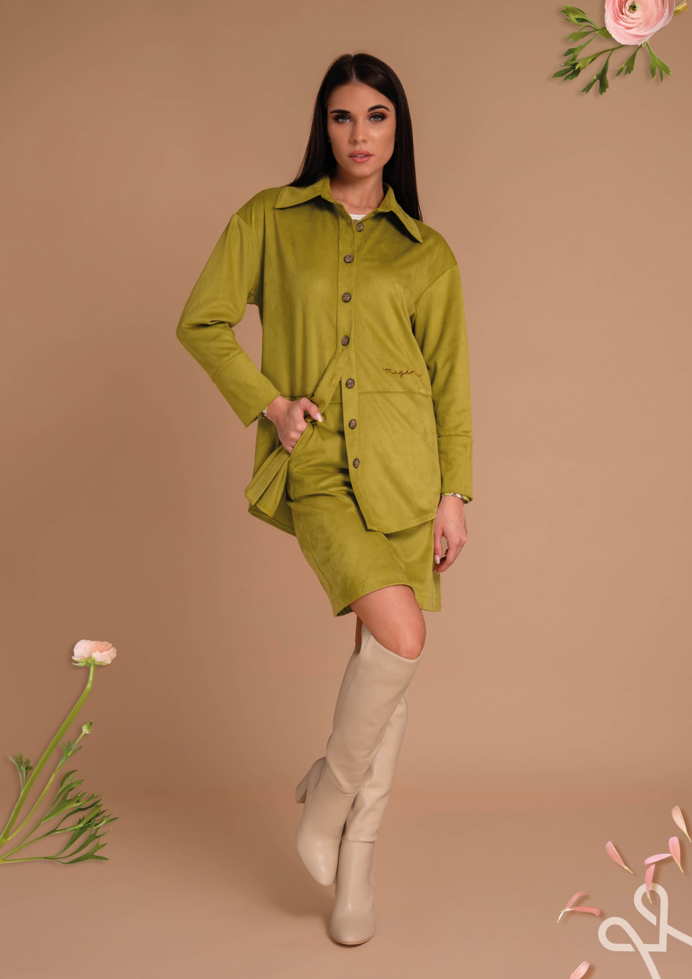 Zöld színű, lazább fazonú velúr női ing elején gombos záródással, oldalán hímzéssel díszítve, gallérral és széles, gombolható mandzsettával a stílusos tavaszi megjelenésért.